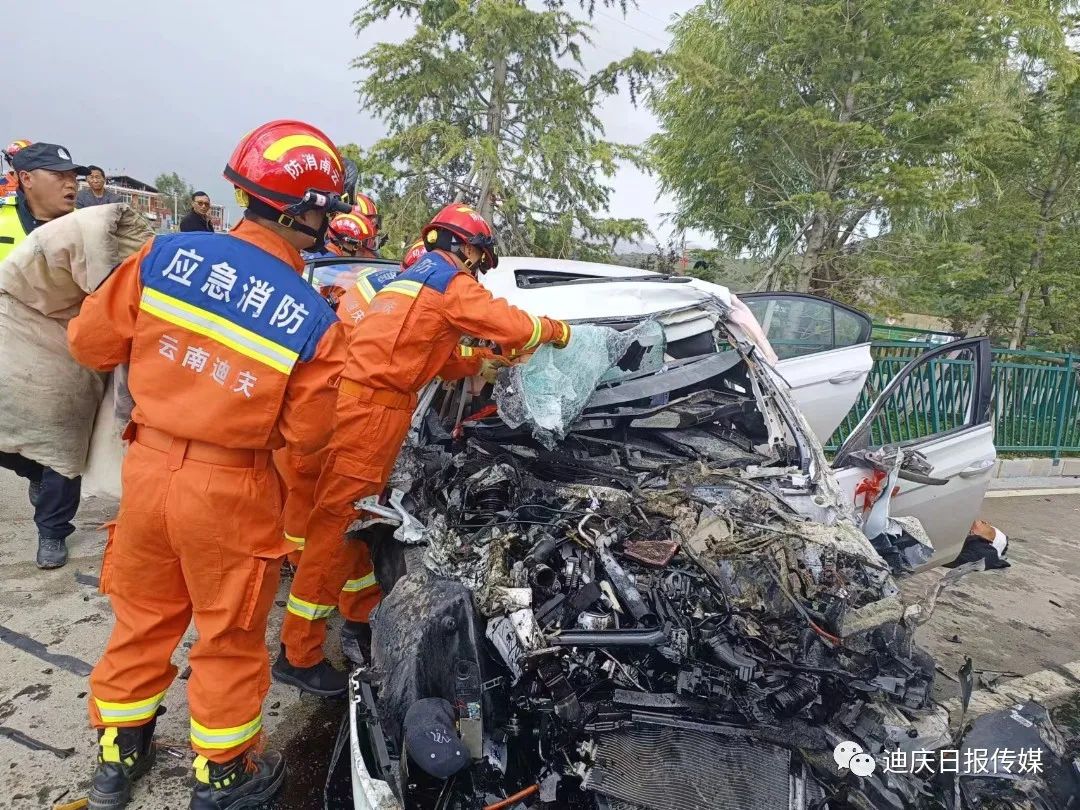接到調(diào)令后,香格里拉消防救援站立即出動(dòng)2車13人前往處置,到達(dá)現(xiàn)場(chǎng)后,發(fā)現(xiàn)一輛小轎車與一輛貨車相撞,轎車嚴(yán)重受損變形,車內(nèi)安全氣囊已彈出,副駕駛位被困人員頭部、腿部多處受傷無法動(dòng)彈,意識(shí)模糊,有嚴(yán)重生命危險(xiǎn)。