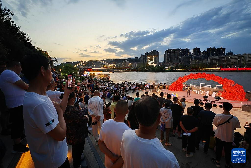 7月19日,在蘭州市城關(guān)區(qū),游客在黃河岸邊欣賞黃河之濱百日千場(chǎng)音樂(lè)展演活動(dòng)。新華社記者 范培珅 攝