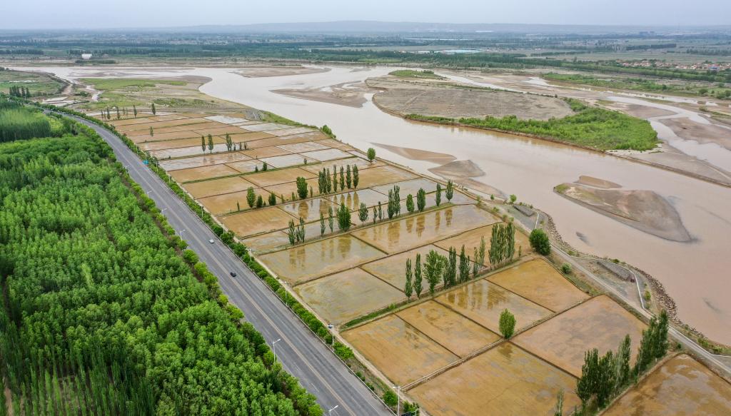 流經(jīng)寧夏青銅峽市境內(nèi)的黃河,滋潤著岸邊水稻和各種植被(無人機照片,5月25日攝)。新華社記者馮開華 攝