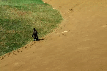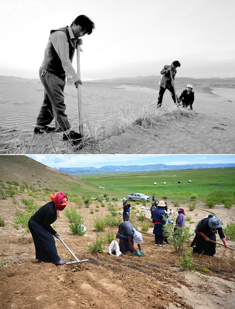 拼版照片:上圖為2002年參與防治沙漠化的工作人員在瑪曲縣黃河沿岸一處沙化草場(chǎng)上壓沙(新華社記者 韓傳號(hào) 攝);下圖為2023年7月6日,牧民在瑪曲縣黃河沿岸一處沙化草原治理點(diǎn)進(jìn)行草籽補(bǔ)種工作(新華社記者 張可任 攝)。