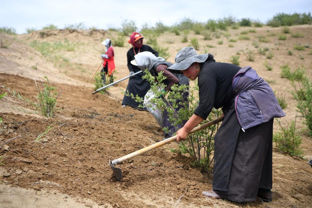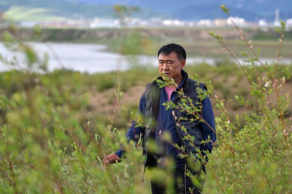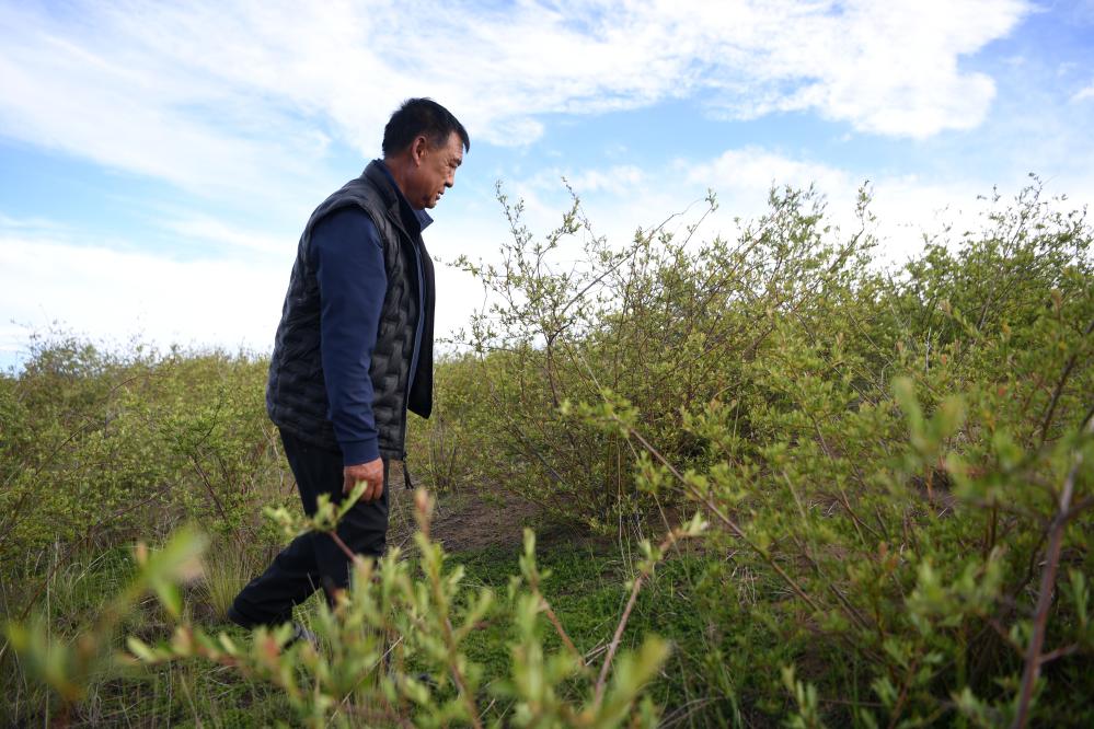 多年投身沙化草原治理的牧民卓瑪加布在黃河瑪曲段干流沿岸一處沙化草原治理點(diǎn)查看他參與種植的植被生長(zhǎng)情況(7月5日攝)。新華社記者 陳斌 攝