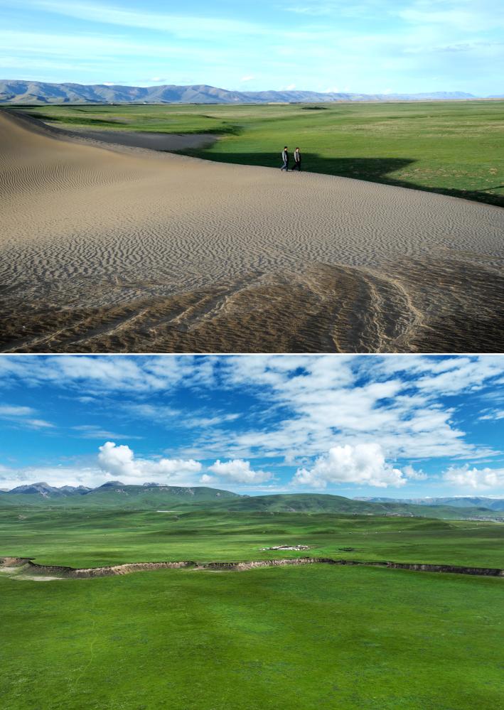 拼版照片:上圖為2011年6月9日,兩名技術(shù)人員在甘南藏族自治州瑪曲縣歐拉鄉(xiāng)歐強(qiáng)村查看草場(chǎng)沙化退化情況,這里已經(jīng)成為當(dāng)時(shí)瑪曲草原沙化最為嚴(yán)重的草場(chǎng)之一(新華社記者 聶建江 攝);下圖為2023年7月6日在甘南藏族自治州瑪曲縣歐拉鎮(zhèn)歐強(qiáng)村境內(nèi)拍攝的經(jīng)過(guò)治理修復(fù)的草原(新華社記者 陳斌 攝)。