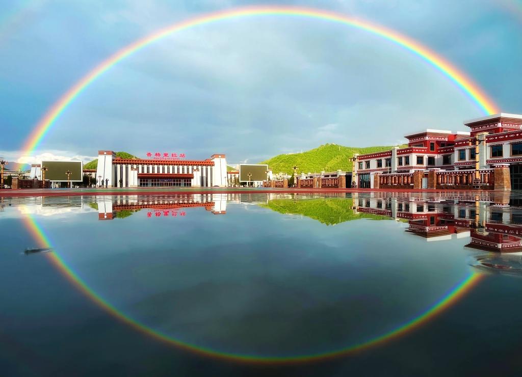 9月18日,彩虹下的滇藏鐵路麗香段香格里拉站。(中國鐵路昆明局集團公司供圖)