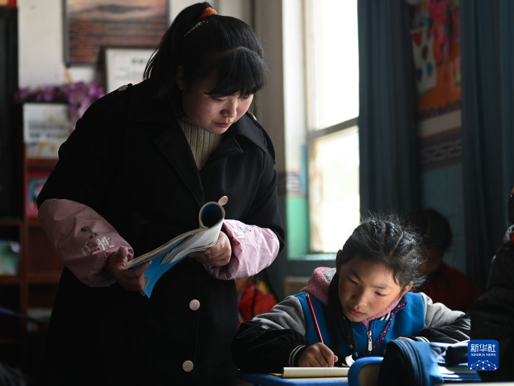在曲麻萊縣葉格鄉(xiāng)幼兒園,教師旦增卓瑪(右)在課堂上和小朋友互動(9月13日攝)。新華社 張宏祥 攝