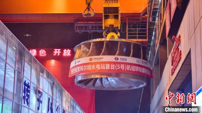 9月27日,瑪爾擋水電站首臺機組水輪機轉輪成功吊裝。(瑪爾擋水電站供圖)