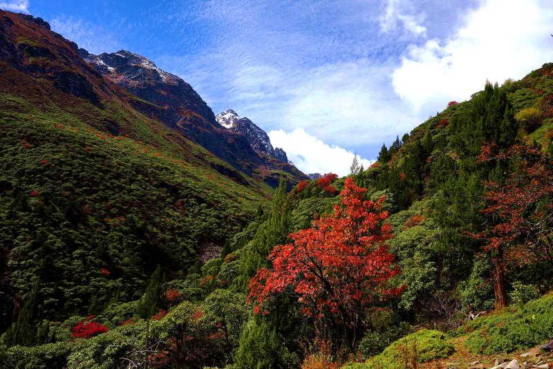 藍(lán)天、白云、彩林與山頂?shù)陌籽?gòu)成一幅絕美風(fēng)光圖,隨手一拍都很美