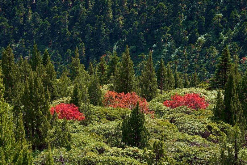 火紅的樹(shù)葉如同一叢叢盛開(kāi)的鮮花點(diǎn)綴在綠樹(shù)間