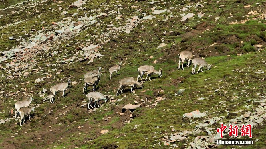 圖為成群巖羊在山坡上覓食。