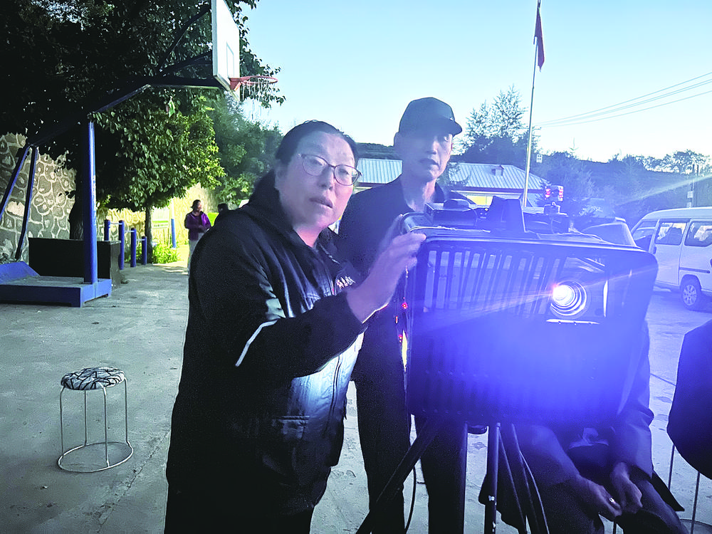 左圖:黃得梅(左)在海東市樂(lè)都區(qū)馬營(yíng)鄉(xiāng)卡拉村放映電影。
