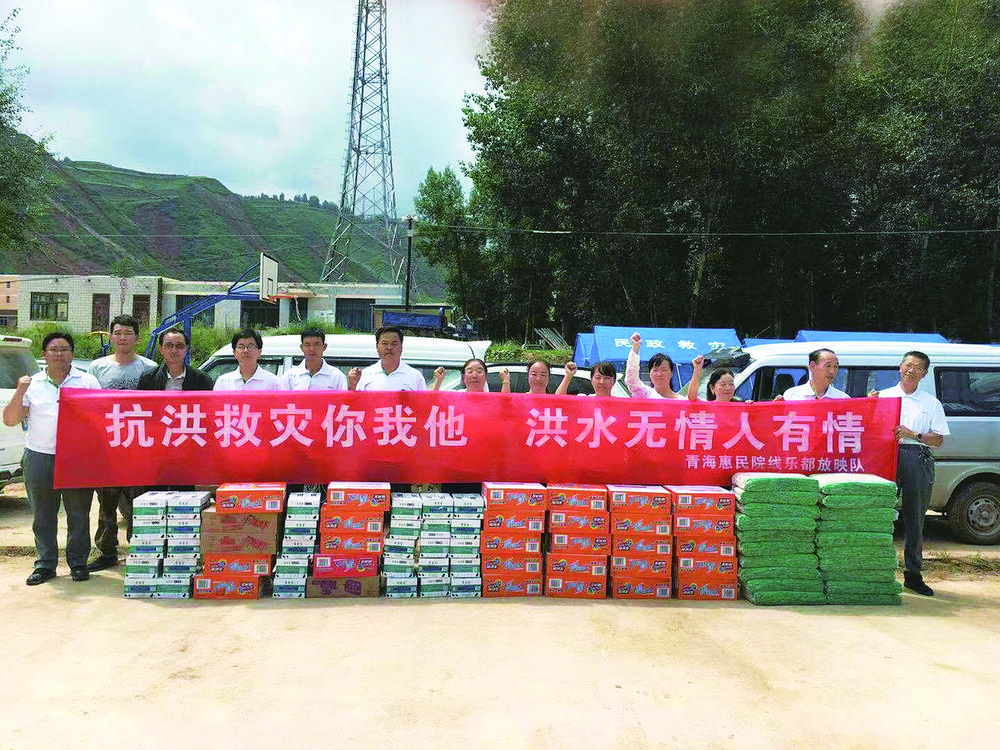 2022年,樂(lè)都區(qū)中壩藏族鄉(xiāng)發(fā)生洪災(zāi),黃得梅帶頭捐款,放映隊(duì)16名放映員買(mǎi)了一車(chē)方便面、牛奶、礦泉水和掛面送到了中壩。雖然洪水把很多路段都沖斷了,但是隊(duì)員們硬是用架子車(chē)把設(shè)備拉了上去,把溫暖和光影送給了受災(zāi)群眾。