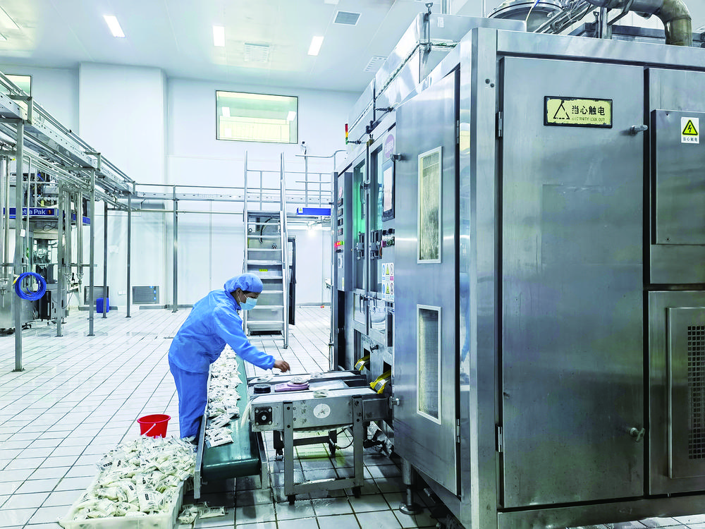 青海雪峰牦牛乳業(yè)有限責任公司工作人員對流水線產(chǎn)品做抽檢復稱。宋翠茹 攝