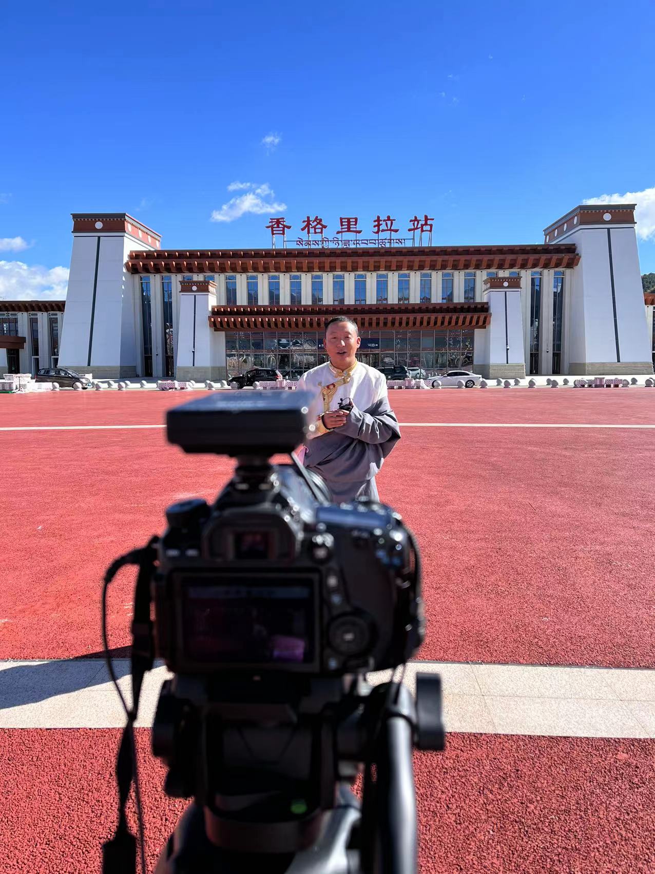 迪慶日?qǐng)?bào)社記者央金拉姆在香格里拉火車(chē)站拍攝鐵路鋪軌情況。