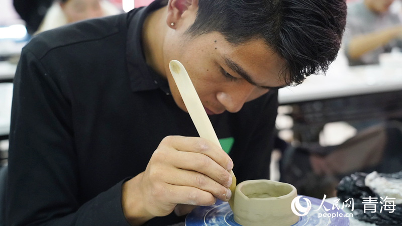 制作陶瓷坯體,打磨坯體內(nèi)外……踏進(jìn)班瑪縣電子商務(wù)公共服務(wù)中心培訓(xùn)室,十幾名學(xué)員正在學(xué)做黑陶,拉坯機(jī)轉(zhuǎn)過一圈又一圈,學(xué)員們打磨一遍又一遍,沾著泥巴的雙手,十分專注的眼神,將人帶入班瑪黑陶的世界,木板與土坯摩擦之間,一件件班瑪黑陶作品就此誕生。