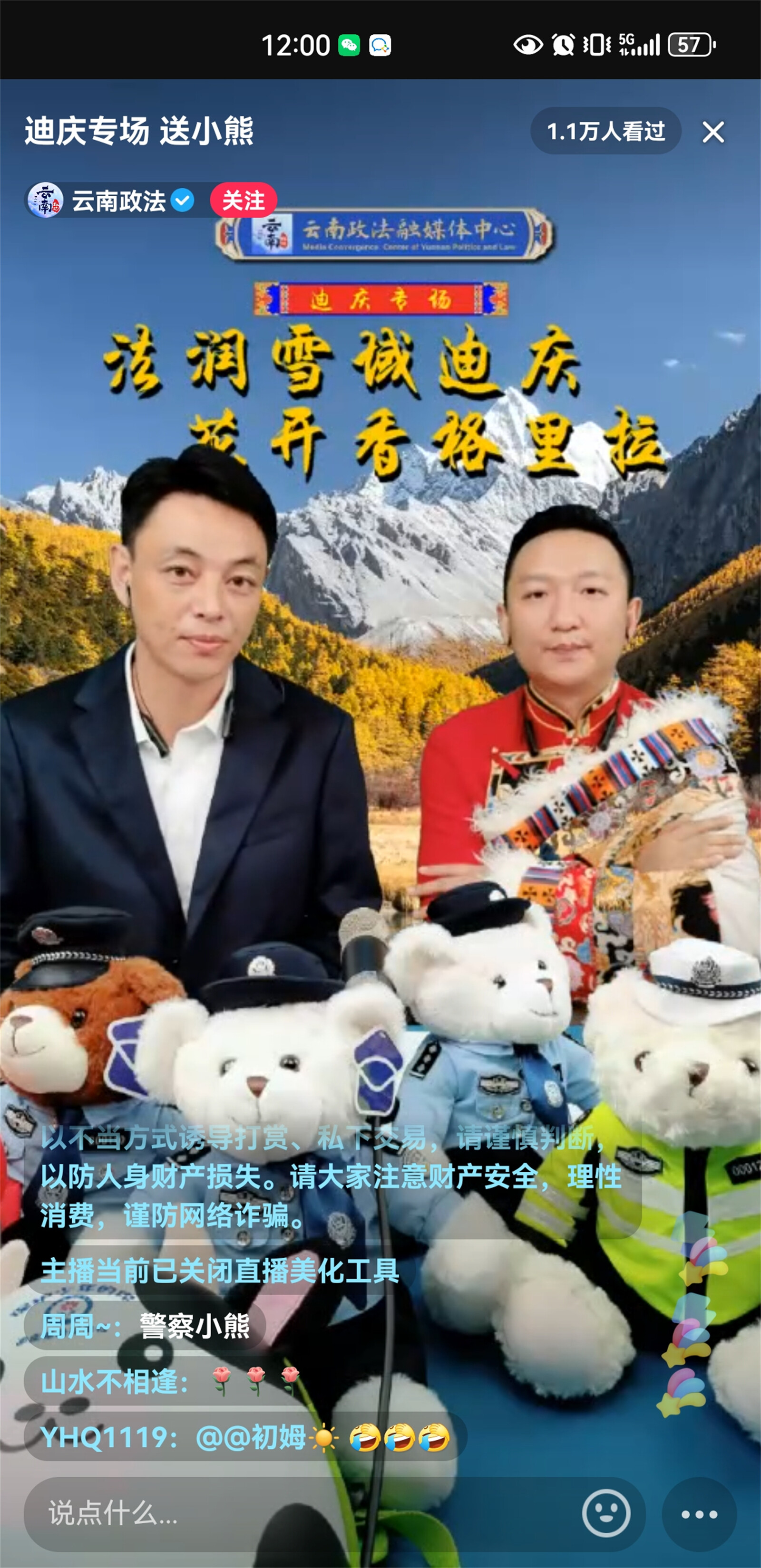 近日,迪慶州政法干警走進(jìn)云南政法普法強基直播間開展“法潤雪域迪慶、花開香格里拉”迪慶州普法專場直播,直播聚焦群眾關(guān)切,緊密聯(lián)系時事熱點,帶廣大網(wǎng)友體驗了一場內(nèi)容豐富的普法之旅,共吸引9.1萬人觀看,獲點贊超10.4萬。