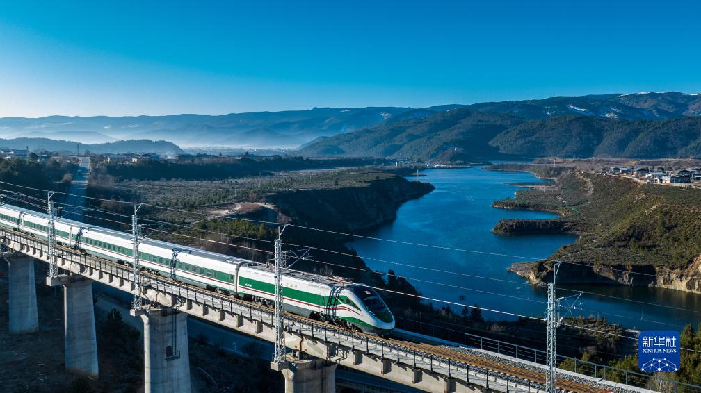 11月26日,列車行駛在麗香鐵路線上(無人機(jī)照片)。新華社記者 邢廣利 攝