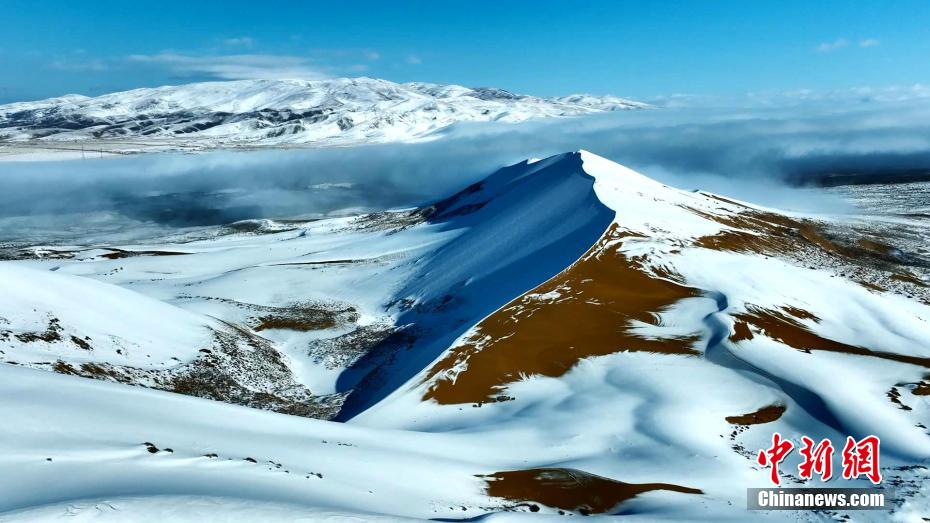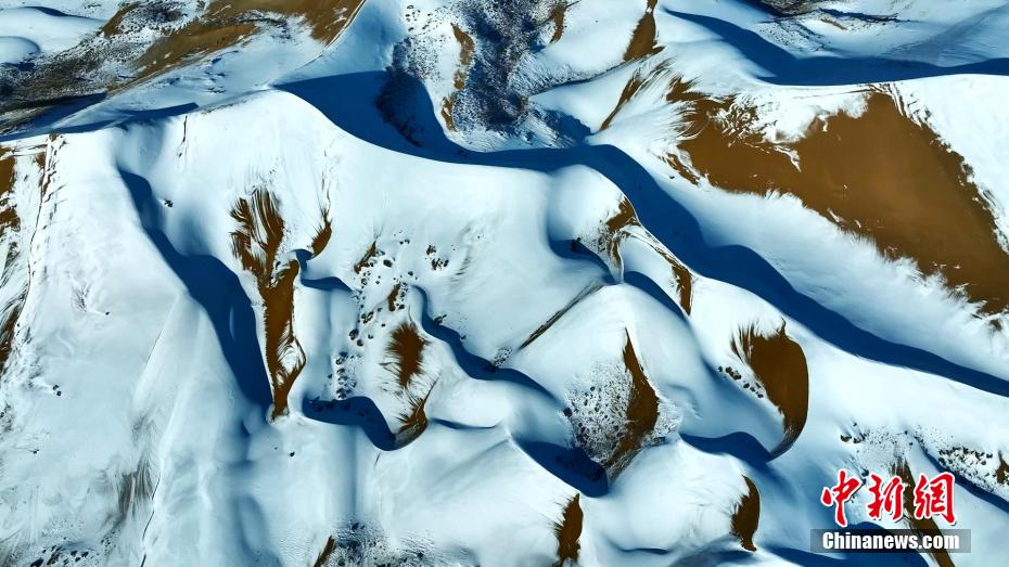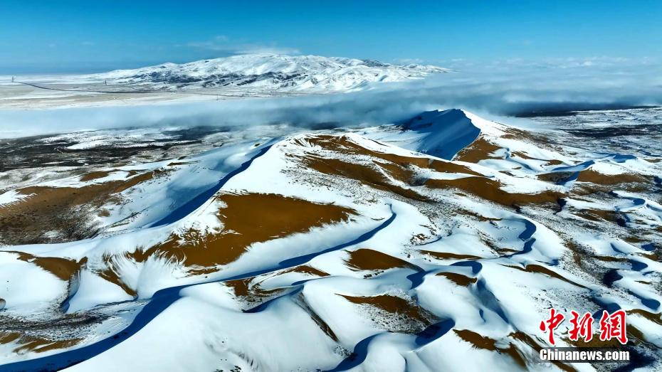 12月中旬,高原青海迎來新一輪寒潮。在青海湖北岸的青海省海北藏族自治州海晏縣,攝影師在金沙灣拍攝到雪落金沙的冬日景色。航拍鏡頭下沙與雪的色彩明暗交錯(cuò)、波瀾起伏,宛如大自然為大地“咖啡”“拉花”,藍(lán)白交織的純凈讓人心曠神怡。雪后初晴,云河在沙丘間流動(dòng),時(shí)而隨著氣流“流入”青海湖,沙丘背后的蔚藍(lán)湖水,也讓景色變得奇幻優(yōu)美。青海湖是中國最大的內(nèi)陸高原咸水湖,是維系青藏高原東北部生態(tài)安全的重要水體,也是控制西部荒漠化向東蔓延的天然屏障。