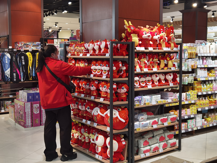 農(nóng)貿(mào)市場(chǎng)一片火熱景象,而在各大超市里,各種龍年喜慶元素的年貨擺在貨架最顯眼的位置,增添了不少節(jié)日氛圍。顧客以年輕人居多,購物車?yán)锇b精美的各類產(chǎn)品琳瑯滿目。