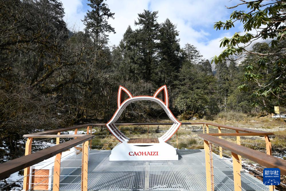 這是1月10日拍攝的海螺溝景區(qū)草海子步游道上一處裝置。景區(qū)重建時在步游道上新增了動物造型裝置,供游客拍照打卡。新華社記者 胥冰潔 攝