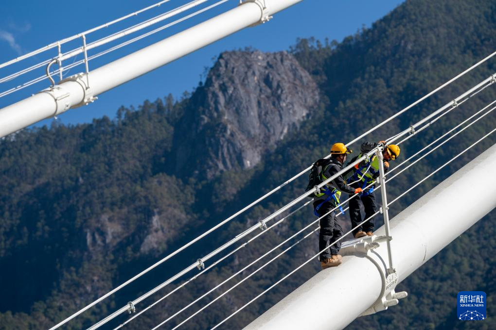 1月24日,工區(qū)班長(zhǎng)楊應(yīng)文(右)和工友劉榕基在主纜上巡檢。新華社記者 陳欣波 攝