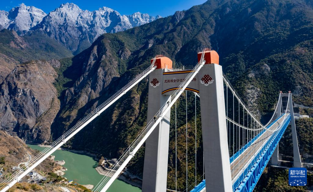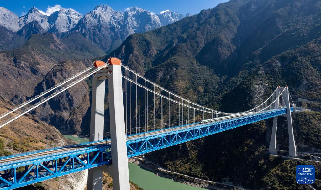 1月24日,列車(chē)通過(guò)虎跳峽金沙江鐵路大橋。新華社記者 陳欣波 攝