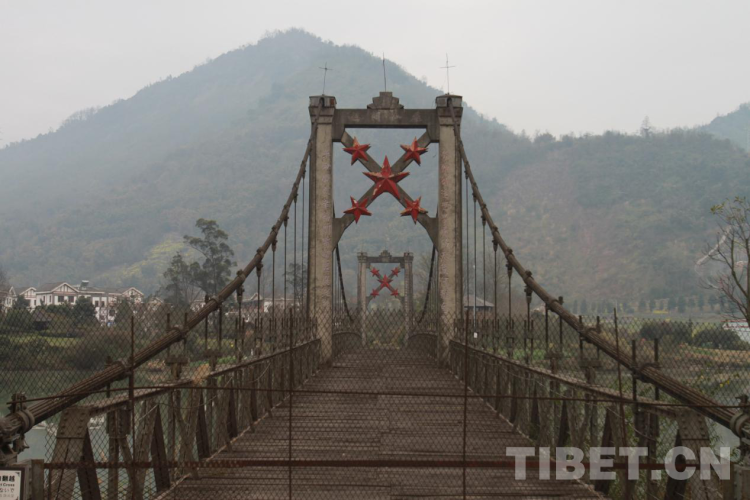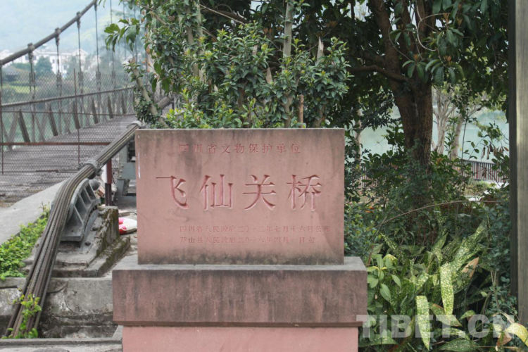 站在橋邊,遙望蜿蜒的江水就是青衣江,飛仙關(guān)橋全長164米,寬4.5米,索塔為鋼筋混凝土門式框架,高29米,流動式索鞍,策略式索錠,當(dāng)時(shí)的設(shè)計(jì)載重為15噸。橋柱橫額上有時(shí)任西南軍政委員會主席劉伯承所題寫的橋名——“飛仙關(guān)橋”。橋西岸塔柱有時(shí)任十八軍政委譚冠三題寫的檻聯(lián)——“發(fā)揮天才,發(fā)揮力量,戰(zhàn)勝困難,創(chuàng)造人民幸福,一面進(jìn)軍,一面建設(shè)解放西藏,鞏固西南國防”的字樣。東岸塔柱上有時(shí)任西康省主席廖志高題寫的檻聯(lián)——“勞動創(chuàng)造世界飛仙天險(xiǎn)何難克服,革命帶來幸福閉塞邊區(qū)從此繁榮”字樣。橋上五顆閃閃的紅星,映照著飛仙關(guān)的繁榮,也印證著革命前輩們的美好愿景已經(jīng)變?yōu)楝F(xiàn)實(shí)。