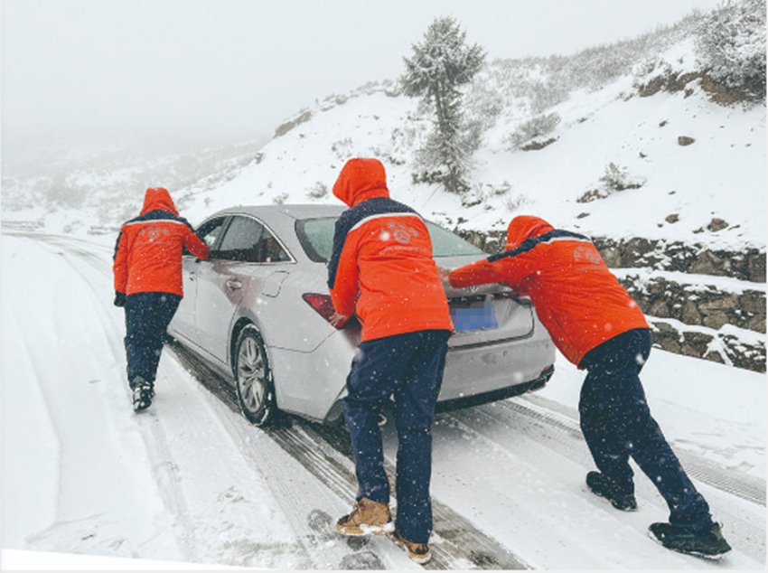理塘公路分局組織沿線各站點(diǎn)派遣除雪保通隊(duì)伍,采用科學(xué)合理的方式配置機(jī)械設(shè)備,全身心地投入到除雪保通的艱巨任務(wù)之中。各個作業(yè)點(diǎn)運(yùn)用高效的作業(yè)方式,以機(jī)械化作業(yè)為主導(dǎo),人工輔助為支撐鋪撒防滑沙,竭力保障道路通行的安全。作業(yè)人員全力以赴、分秒必爭地清除道路積雪,奮力守護(hù)公路的安全與暢通無阻。在巡查過程中,工作人員幫助被困車輛從積雪中解救出來,確保道路暢通。