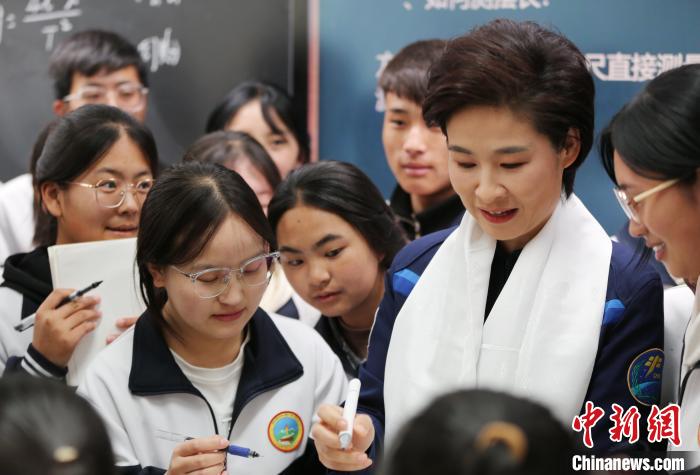 當(dāng)日,身穿天藍(lán)色航天員訓(xùn)練服的劉洋,神采奕奕。接受高原藏鄉(xiāng)民眾潔白哈達(dá)后,她在尖扎縣第二民族中學(xué),參加“鹿鳴課堂”公開課,講述夢想的故事,并帶此間師生“遨游”太空。