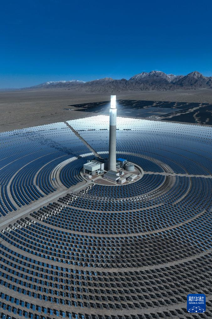 這是4月23日在青海省海西蒙古族藏族自治州德令哈市光伏(光熱)產(chǎn)業(yè)園拍攝的光熱電站(無人機照片)。新華社記者 張龍 攝