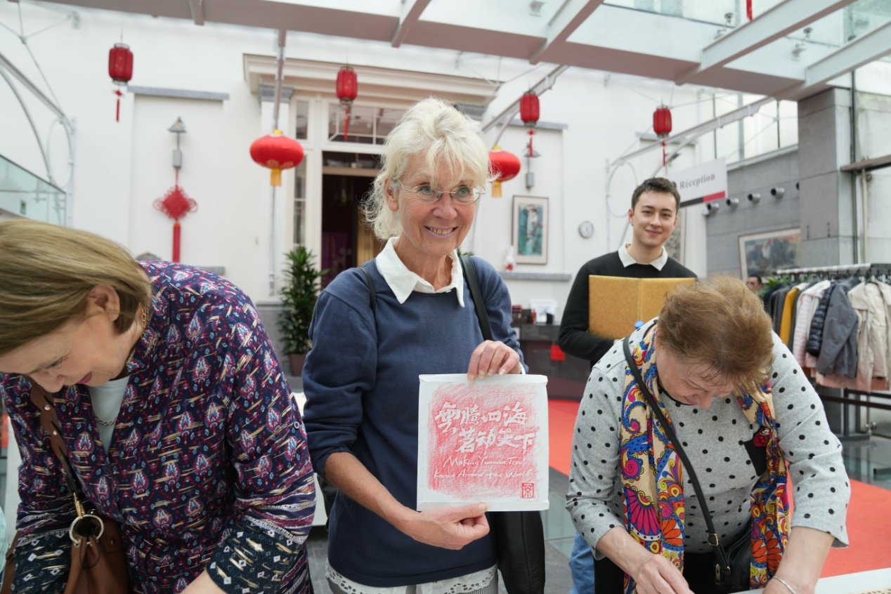 從法國巴黎到比利時布魯塞爾,傳拓體驗區(qū)人山人海。傳拓工藝可以將每一片傳統(tǒng)的“七子餅”茶量身定制成層次分明、索條清晰的獨特“身份證”,而隨著墨棒掃過,一幅幅“茶馬古道”“云騰四?!ぼ鴦犹煜隆蓖禺嬡S然紙上。引得嘉賓忍不住上手體驗,并將制作好的作品珍藏。
