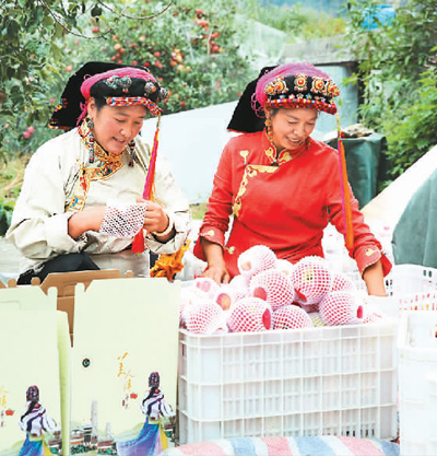 四川省甘孜藏族自治州丹巴縣的村民正在包裝“美人脆”蘋果。降初澤郎 攝