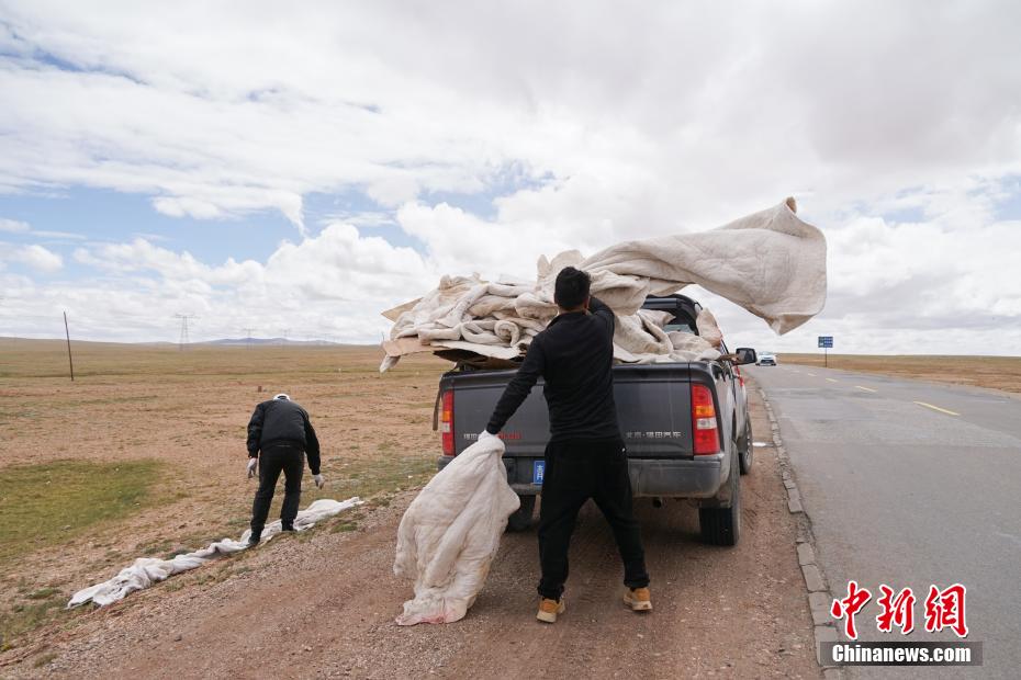 6月20日,三江源國(guó)家公園長(zhǎng)江源園區(qū)可可西里管理處五道梁保護(hù)站的2名生態(tài)管護(hù)員將青藏公路沿線垃圾撿起裝車(chē)。中新社記者 馬銘言 攝