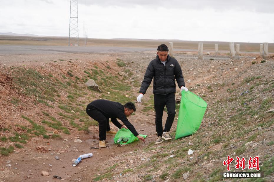 6月20日,三江源國(guó)家公園長(zhǎng)江源園區(qū)可可西里管理處五道梁保護(hù)站2名生態(tài)管護(hù)員在青藏公路沿線撿拾垃圾。中新社記者 馬銘言 攝