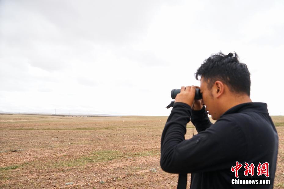6月20日,三江源國(guó)家公園長(zhǎng)江源園區(qū)可可西里管理處五道梁保護(hù)站附近,生態(tài)管護(hù)員德尕利用望遠(yuǎn)鏡在藏羚羊重要遷徙通道——五北大橋附近察看是否有藏羚羊。中新社記者 馬銘言 攝