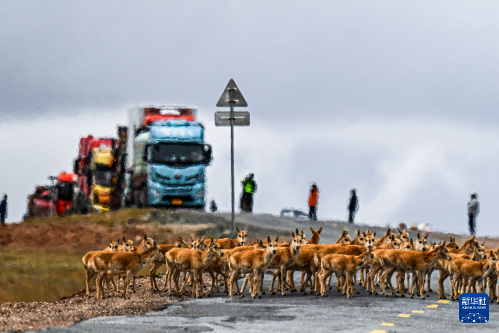 2024年5月27日,藏羚羊在可可西里五道梁地區(qū)通過青藏公路。新華社記者 張龍 攝