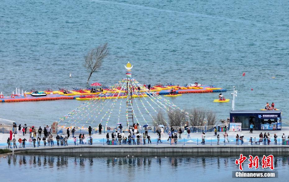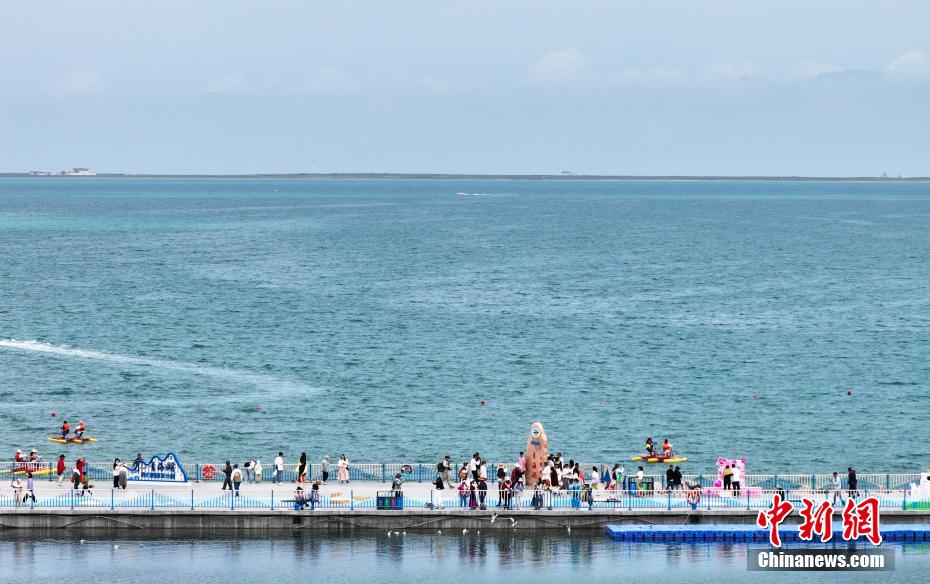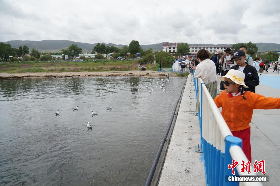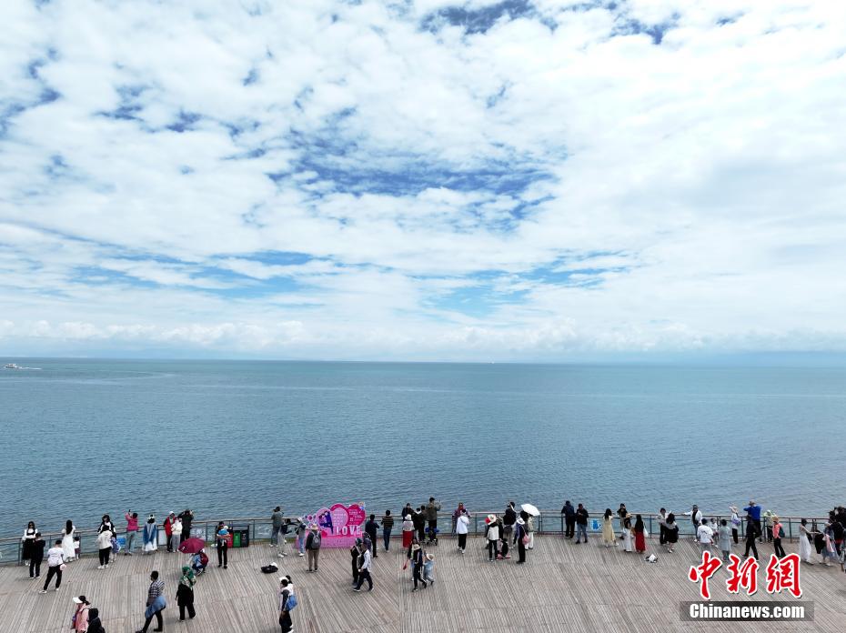 7月8日,游客在青海省海南藏族自治州共和縣青海湖二郎劍景區(qū)內(nèi)觀賞“魚(yú)鳥(niǎo)共生”的生態(tài)景象。中新社記者 馬銘言 攝
