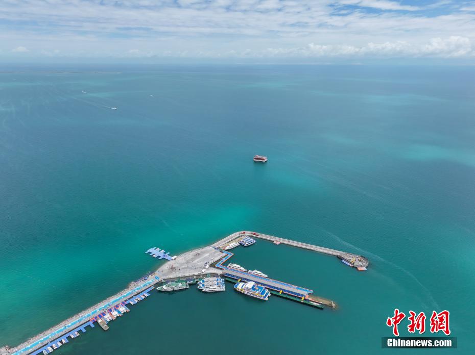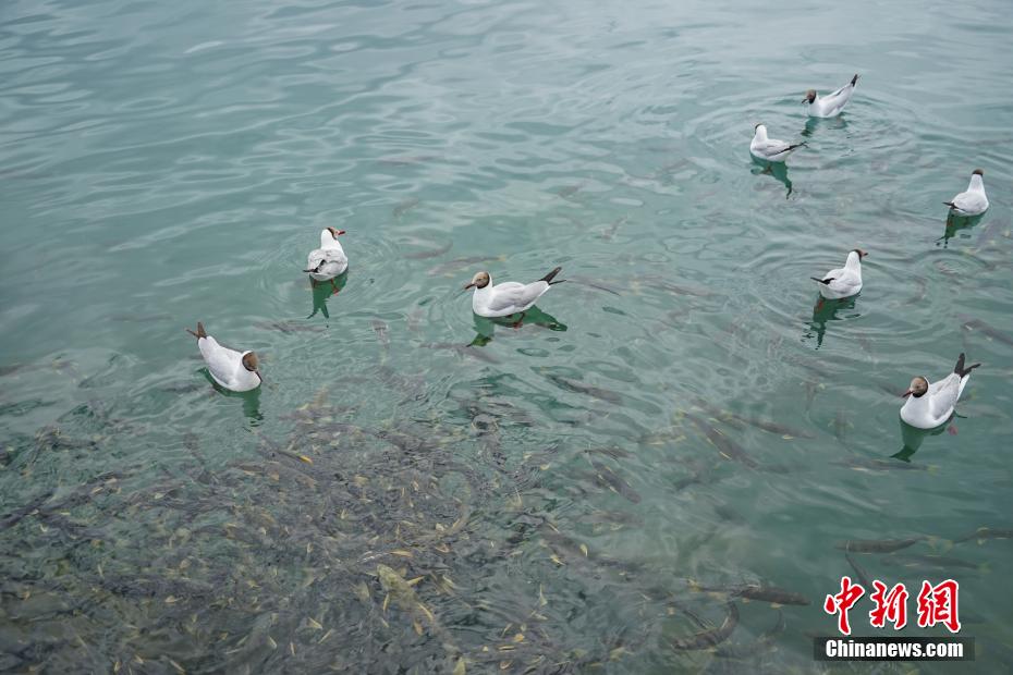 7月8日,青海省海南藏族自治州共和縣青海湖二郎劍景區(qū)內(nèi),“魚(yú)鳥(niǎo)共生”的生態(tài)景象。中新社記者 馬銘言 攝