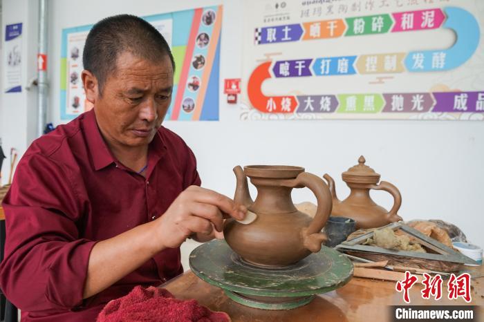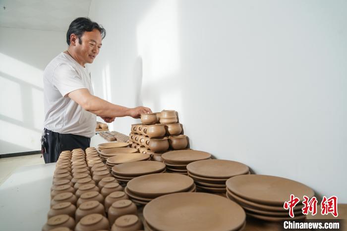 7月18日,在班瑪黑陶培訓(xùn)及體驗(yàn)中心,非遺傳承人謝格太正在清點(diǎn)陶坯數(shù)量。中新社記者 馬銘言 攝