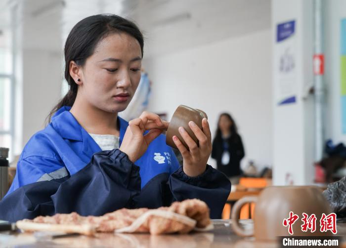7月18日,在班瑪黑陶培訓(xùn)及體驗(yàn)中心,學(xué)員正在打磨班瑪黑陶。中新社記者 馬銘言 攝