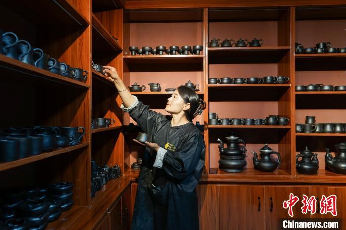 7月18日,在班瑪黑陶培訓(xùn)及體驗(yàn)中心,工作人員挑選創(chuàng)新制作的班瑪黑陶產(chǎn)品。中新社記者 馬銘言 攝