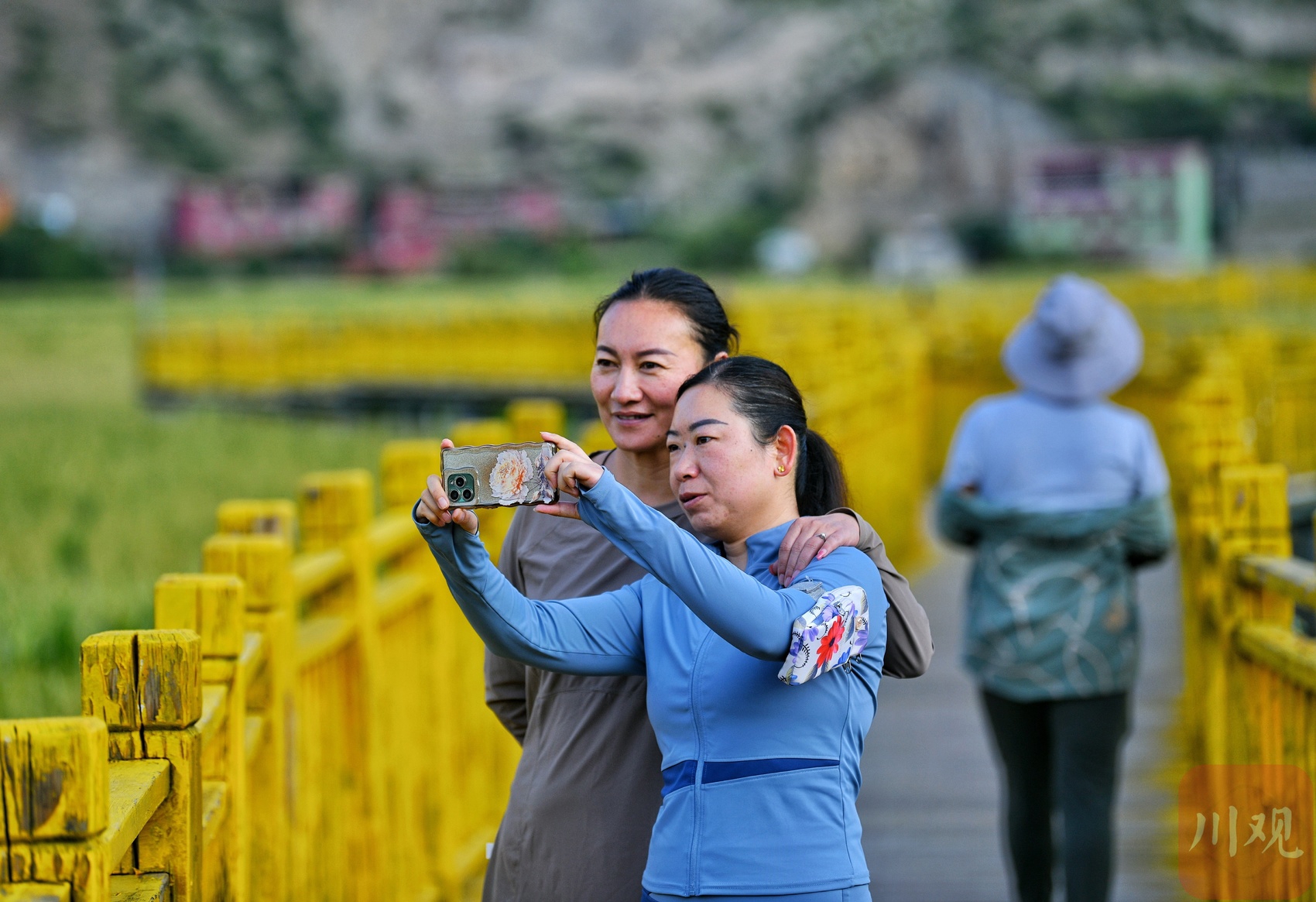 據(jù)了解,“田園棧道”是巴塘縣在農旅結合、觀光農業(yè)方面作為亮點打造的特色景點,現(xiàn)如今是網(wǎng)紅地,不少自駕游的旅行者都會慕名前來田園棧道打卡。吸引的不止是游客,當?shù)鼐用褚蚕矚g早晚來這里漫步??吹接浾咴谂恼眨瑮5郎铣烤毜漠?shù)厝诵χ垼骸斑@里漂亮吧,每天都有像您這樣的人拿著相機來拍照,拍完就走一圈,走棧道一圈只需要2500步。”