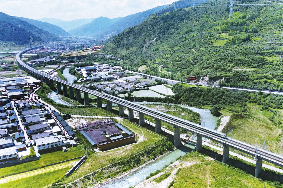 試運(yùn)行列車在川青鐵路鎮(zhèn)江關(guān)至黃勝關(guān)段開(kāi)行。成蘭鐵路公司供圖