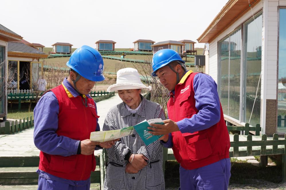 9月2日,“石榴籽”電力流動驛站工作人員為果洛藏貢麻村崗日梅朵旅游度假村工作人員講解安全用電知識。(旺瑪多杰 攝)