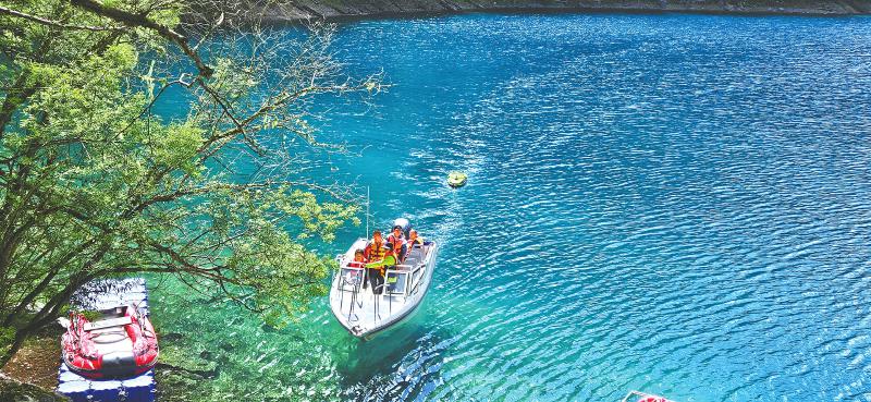 科研團(tuán)隊(duì)成員乘巡邏船在九寨溝長海開展測量工作。韋維 攝
