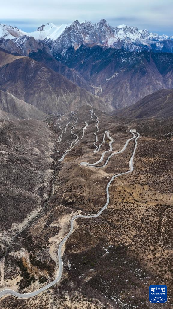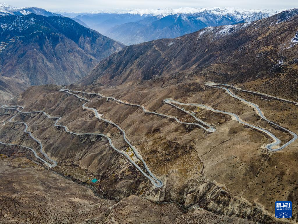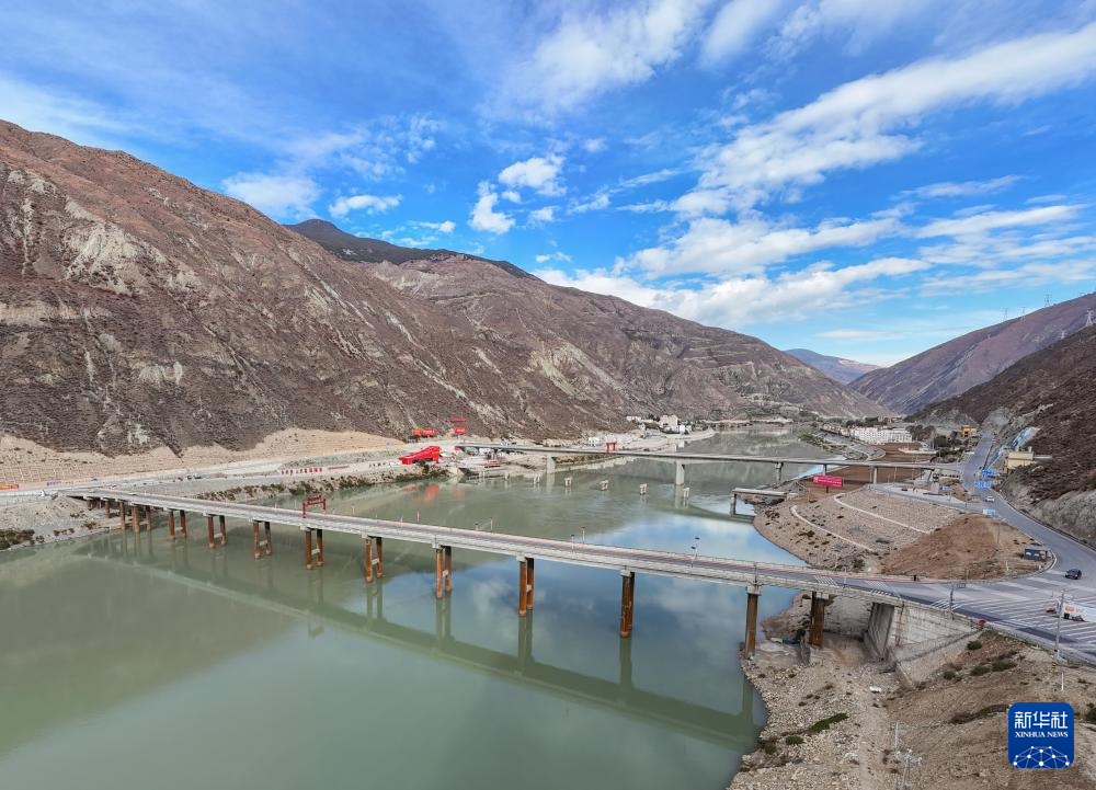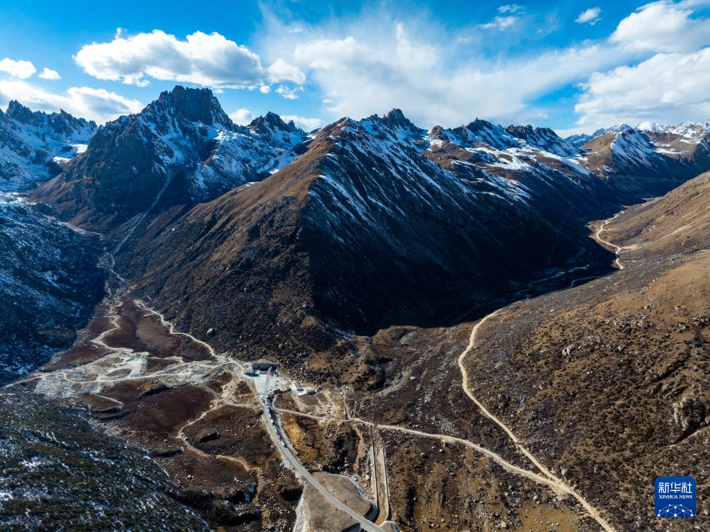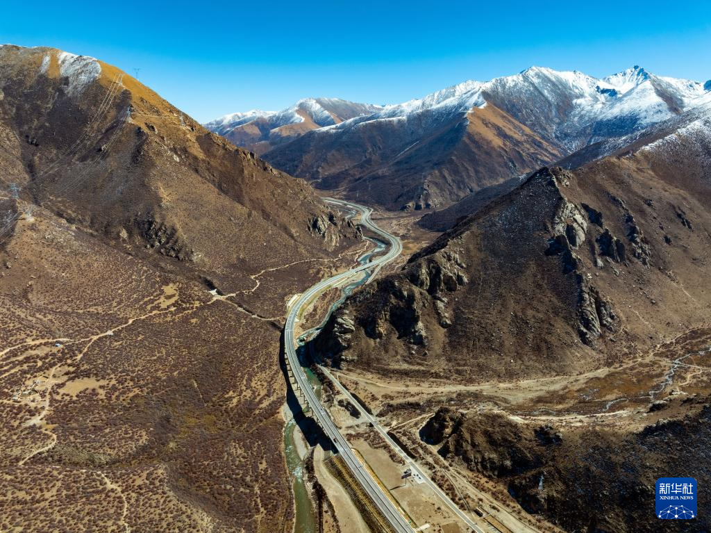 連接四川和西藏的國(guó)道317公路崗?fù)写髽蚶蠘?,遠(yuǎn)處是新修的崗?fù)写髽颍?1月2日攝,無(wú)人機(jī)照片)。新華社記者 王曦 攝