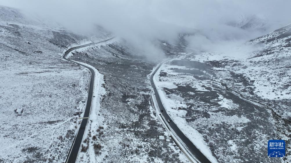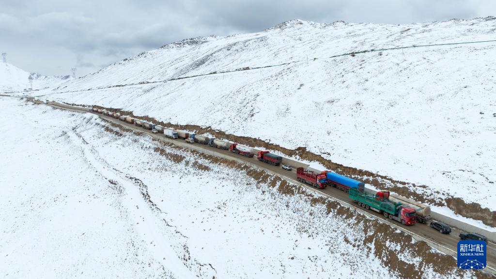 雪后,在西藏自治區(qū)左貢縣境內(nèi),車輛在通往東達(dá)山埡口的國(guó)道318公路上等待通行(11月6日攝,無(wú)人機(jī)照片)。新華社記者 沈伯韓 攝