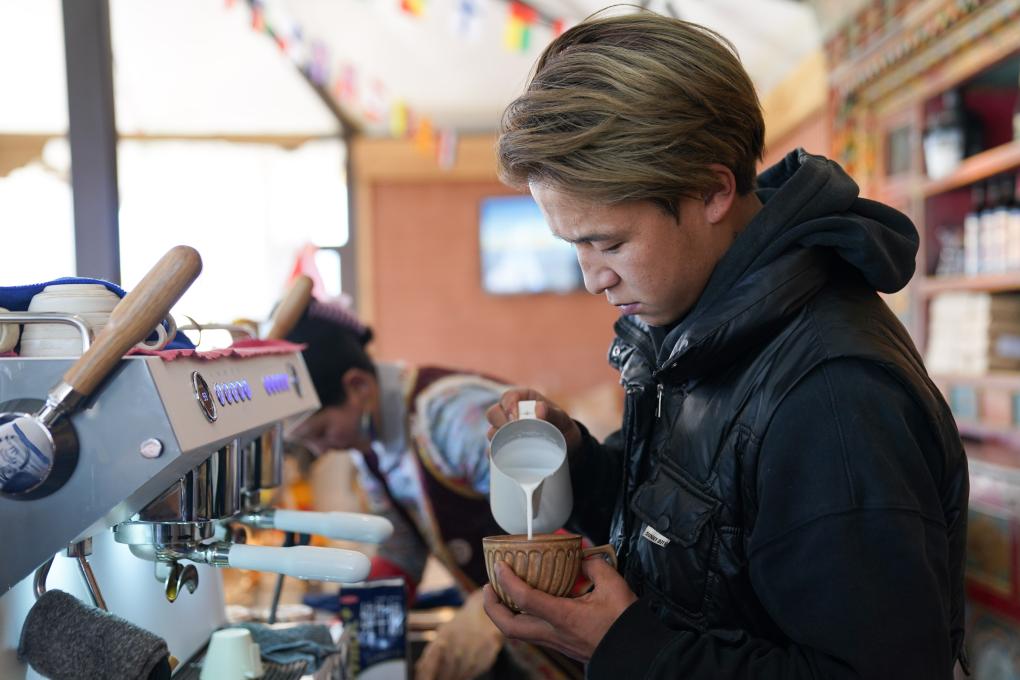 在四川省甘孜藏族自治州康定市的八郎生都村,達科在“云海咖啡屋”制作咖啡(10月28日攝)。