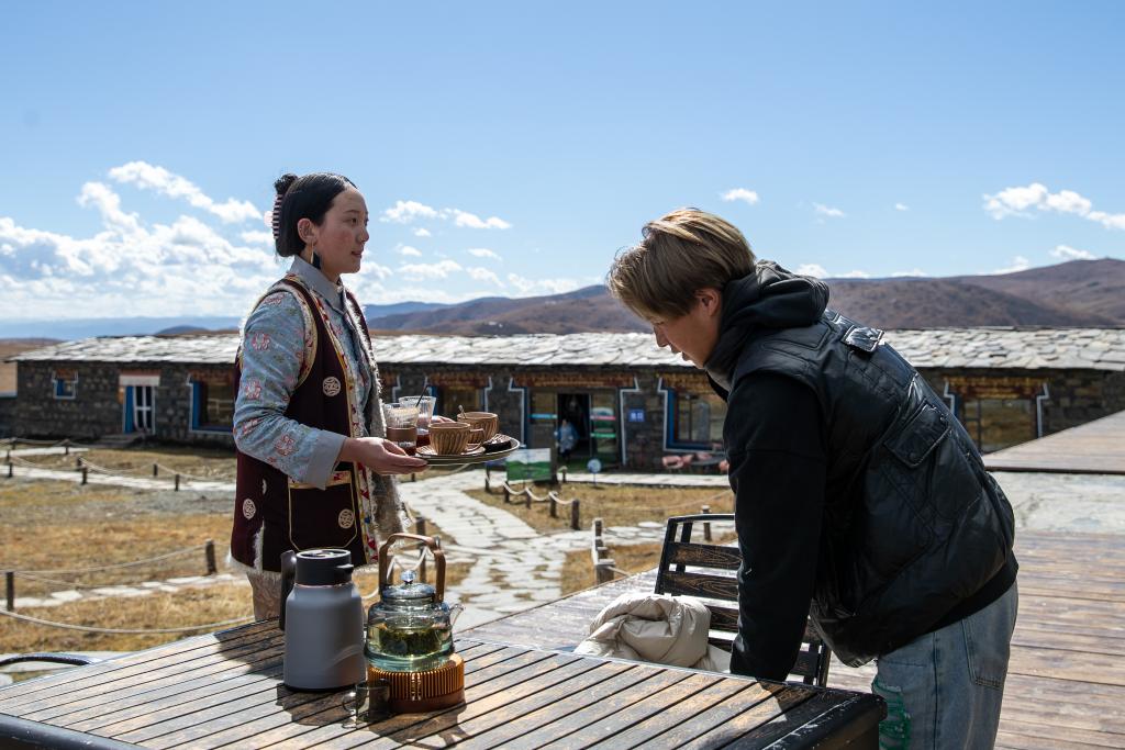 在四川省甘孜藏族自治州康定市的八郎生都村,達科(右)和他的妻子桑志措姆在“云海咖啡屋”外收拾桌子(10月28日攝)。