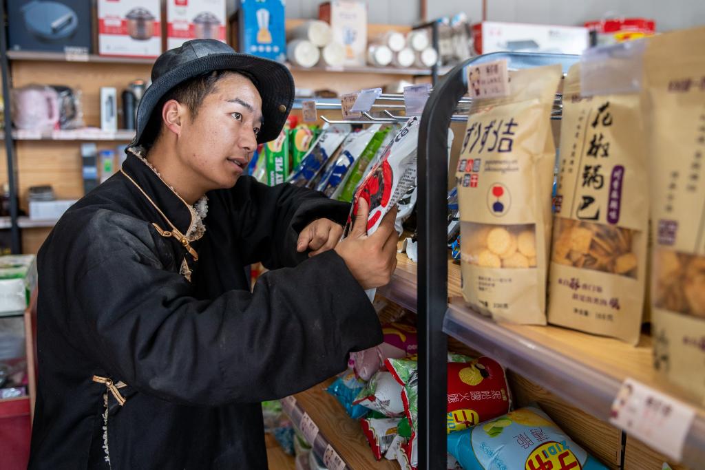 在四川省甘孜藏族自治州理塘縣甲洼鎮(zhèn),達洼在自家的超市整理商品(11月3日攝)。