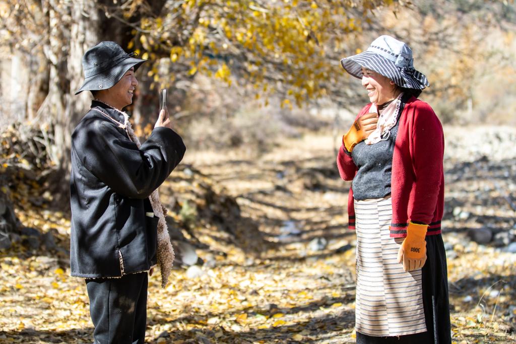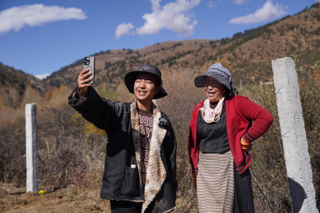 在四川省甘孜藏族自治州理塘縣甲洼鎮(zhèn),達洼(左)和媽媽一同拍攝視頻(11月3日攝)。