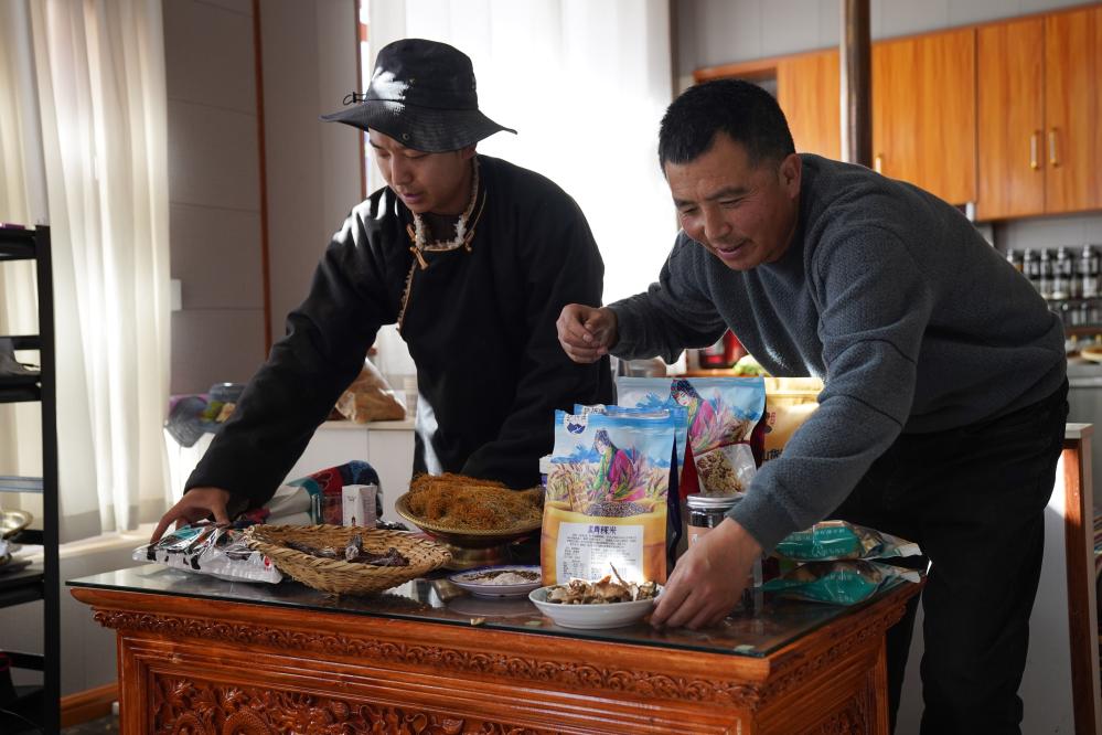 在四川省甘孜藏族自治州理塘縣甲洼鎮(zhèn),達洼(左)和爸爸為當天的直播做準備(11月3日攝)。